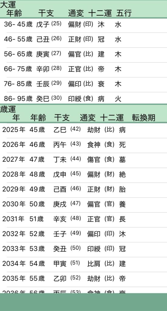 - 2026年: 「生活スタイルが変わりやすい年」であり、仕事のスキルが大きく向上する年です。一方で、「やりたくないような仕事」も受ける暗示がありますが、これは自身のスキルアップのために必要な経験となるでしょう。また、この年は大運の切り替わりも近いことから、今後の人生を左右する大きな変化が起こる可能性も秘めています。