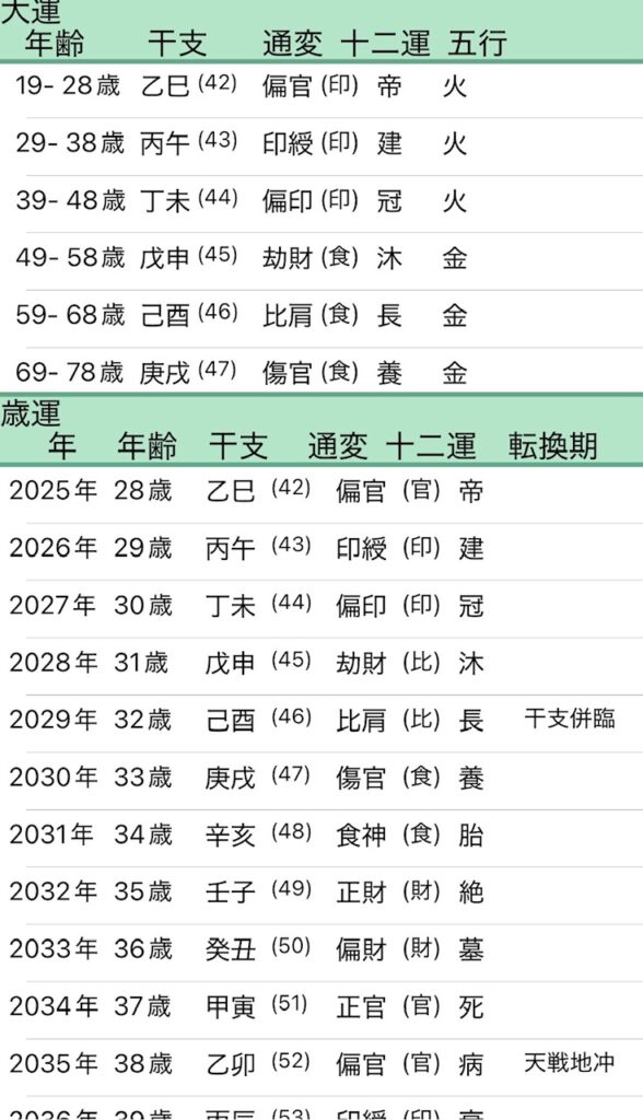 - 大運(19〜28歳):三合会局(さんごうかいきょく)の勢い 命式の「酉・丑」と大運の「巳」が合わさる、三合会局という極めて勢いの強い10年間です。120%の力で突き進める時ですが、常に「全力疾走」のため、OFFの時はしっかり休むことが不可欠です。
