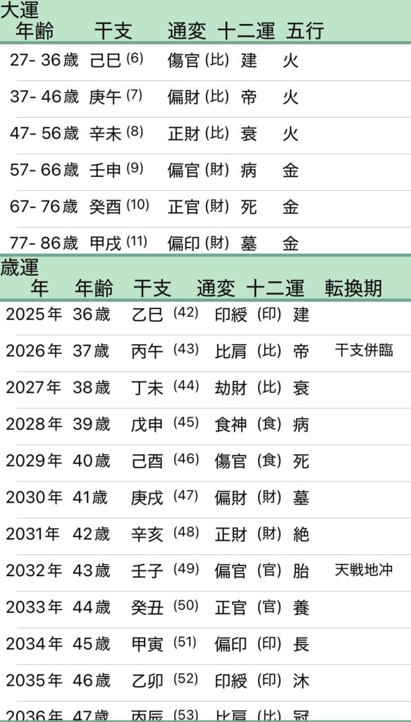 - 2025年:結婚と目標達成の年 この年は、好きなことに夢中になれる年であり、自分の目標が達成しやすいという強い吉運に恵まれます。結婚という目標を達成したことは、この運気の恩恵を最大限に活かした結果と言えるでしょう。また、金運も期待できる年であり、子供との縁があるという暗示も出ています。ただし、命式上の結婚の強さがやや弱い印象があるため、生まれた時間が持つ運勢が、この結婚のタイミングを強く後押しした可能性が非常に高いと考えられます。