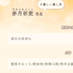 ※公式サイトへ移動後、メニューの「占い師検索」から「赤月祈吏(あかつきいのり)」と入力して検索してください。 もし「予約満了」でも、メール通知設定をしておけばチャンスを逃しません。紫微斗数とヒーリングを組み合わせた赤月先生独自の鑑定は、疲れた心を癒やし、停滞した現状を動かす最短ルートを指し示してくれますよ。